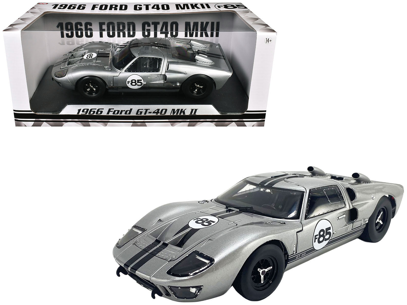 1966 Ford GT-40 MKII #F85 Silver Metallic with Black Stripes 1/18 Diecast Model Car by ACME Made by ACME. Category: Ford Models. High-quality diecast collectible.
