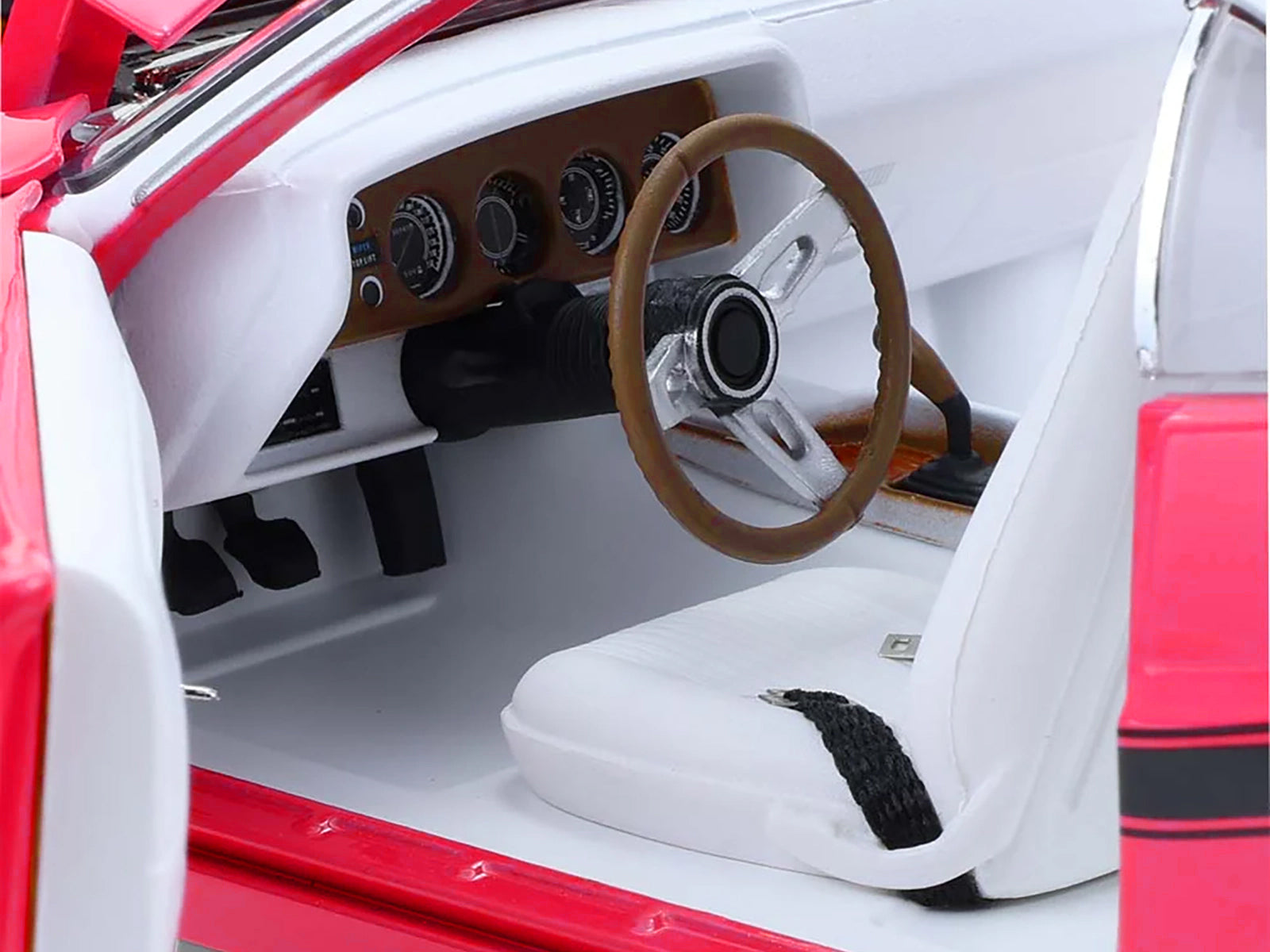 1970 Dodge Challenger R/T 440 Six Pack Panther Pink with Black Stripes White Top and White Interior 1/18 Diecast Model Car by Greenlight