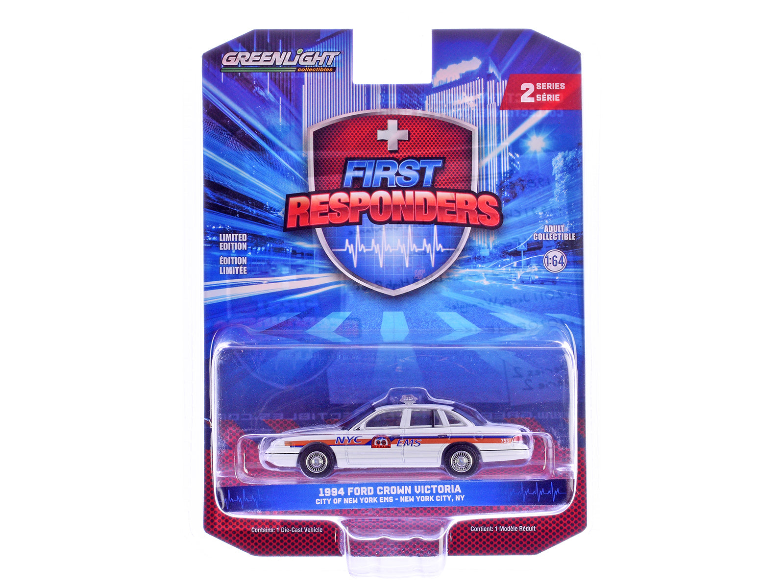 1994 Ford Crown Victoria "NYC EMS (City of New York Emergency Medical Service)" White with Blue and Red Stripes "First Responders" Series 2 1/64 Diecast Model Car by Greenlight Made by Greenlight. Category: Fire and Rescue Models, Ford Models. High-quality diecast collectible.