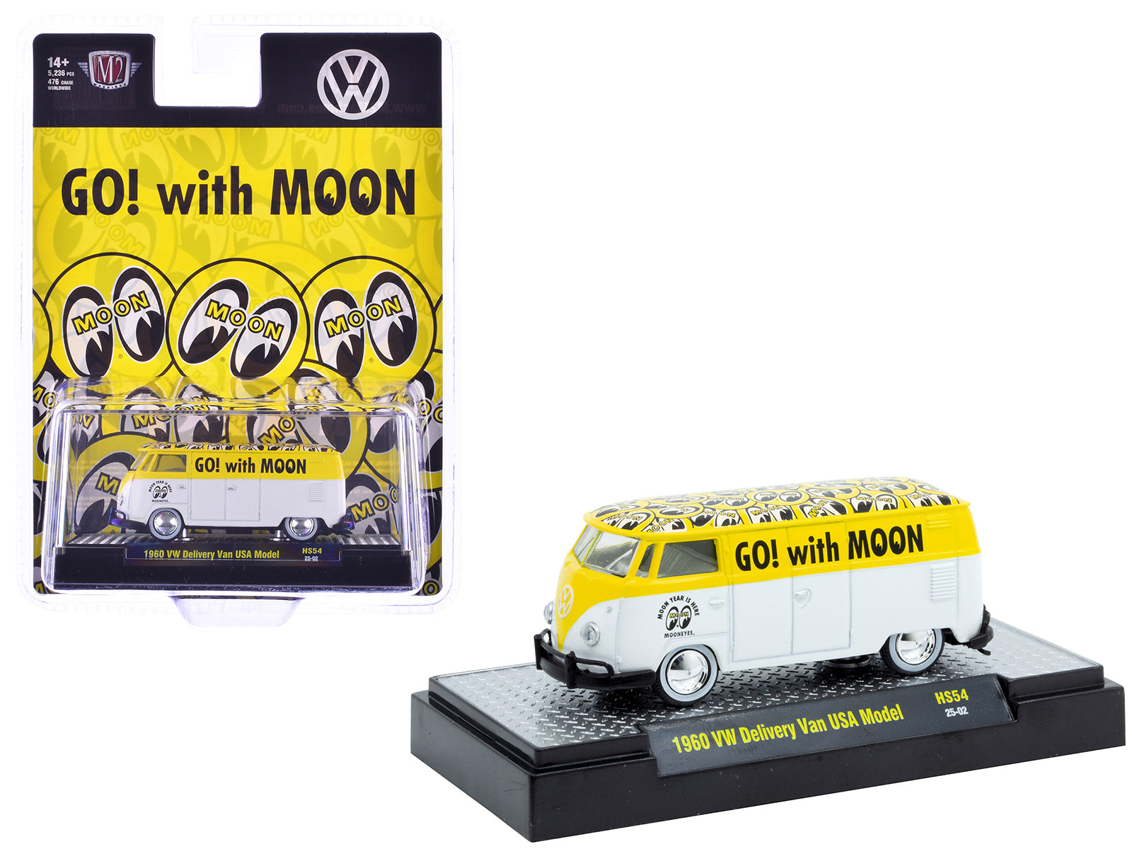 1960 Volkswagen Delivery Van USA Model "MoonEyes" White and Yellow with Top Graphics and White Interior Limited Edition to 5236 pieces Worldwide 1/64 Diecast Model Car by M2 Machines 1/64.