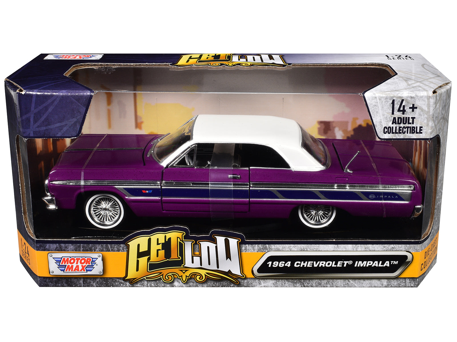 1964 Chevrolet Impala Lowrider Hard Top Purple Metallic with White Top "Get Low" Series 1/24 Diecast Model Car by Motormax Category: Chevrolet Models. High-quality diecast collectible.