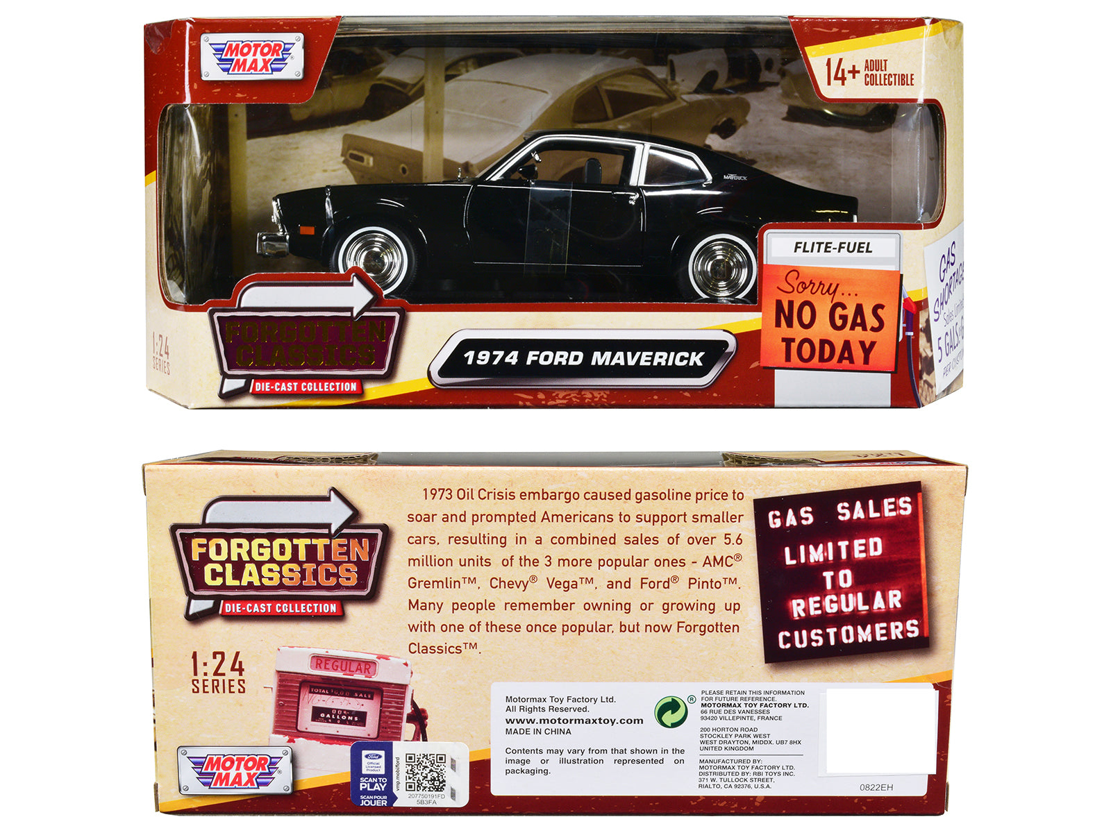 1974 Ford Maverick Black "Forgotten Classics" Series 1/24 Diecast Model Car by Motormax Category: Ford Models. High-quality diecast collectible.