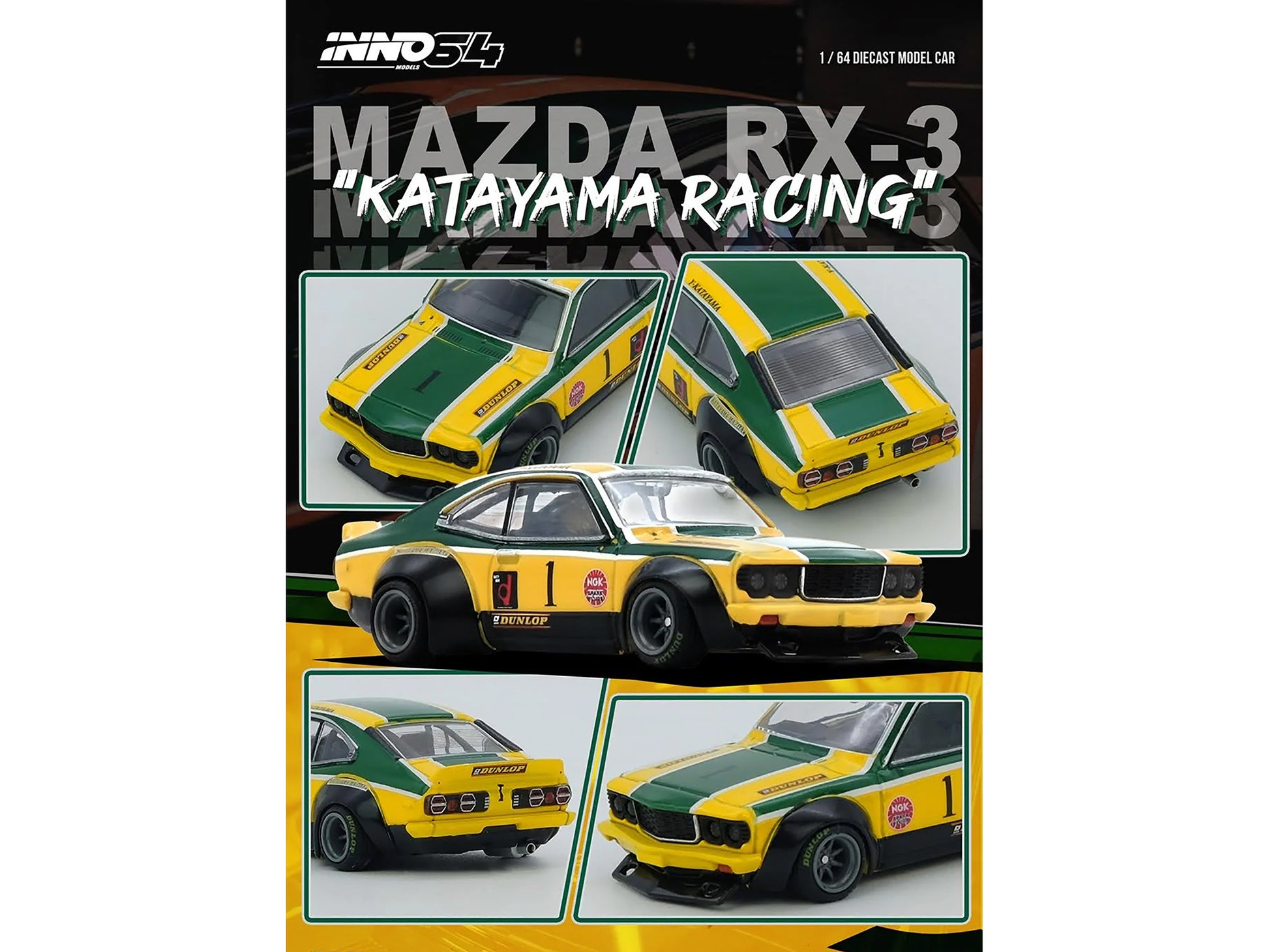 Mazda RX-3 Savanna RHD (Right Hand Drive) #1 "Katayama Racing Livery" Green and Yellow Striped 1/64 Diecast Model Car by Inno Models Made by Inno Models. Category: Mazda Models. High-quality diecast collectible.