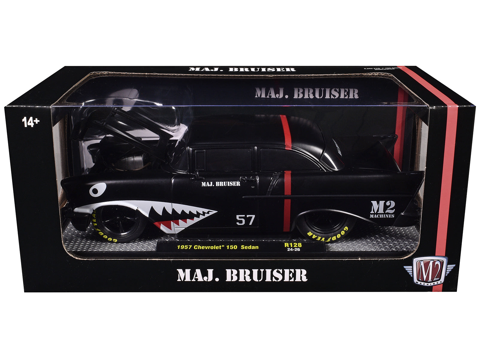 1957 Chevrolet 150 Sedan "Maj. Bruiser" Matt Black with Red Stripe and Shark Mouth Graphics Limited Edition to 6650 pieces Worldwide 1/24 Diecast Model Car by M2 Machines Made by M2 Machines. Category: Chevrolet Models. High-quality diecast collectible.