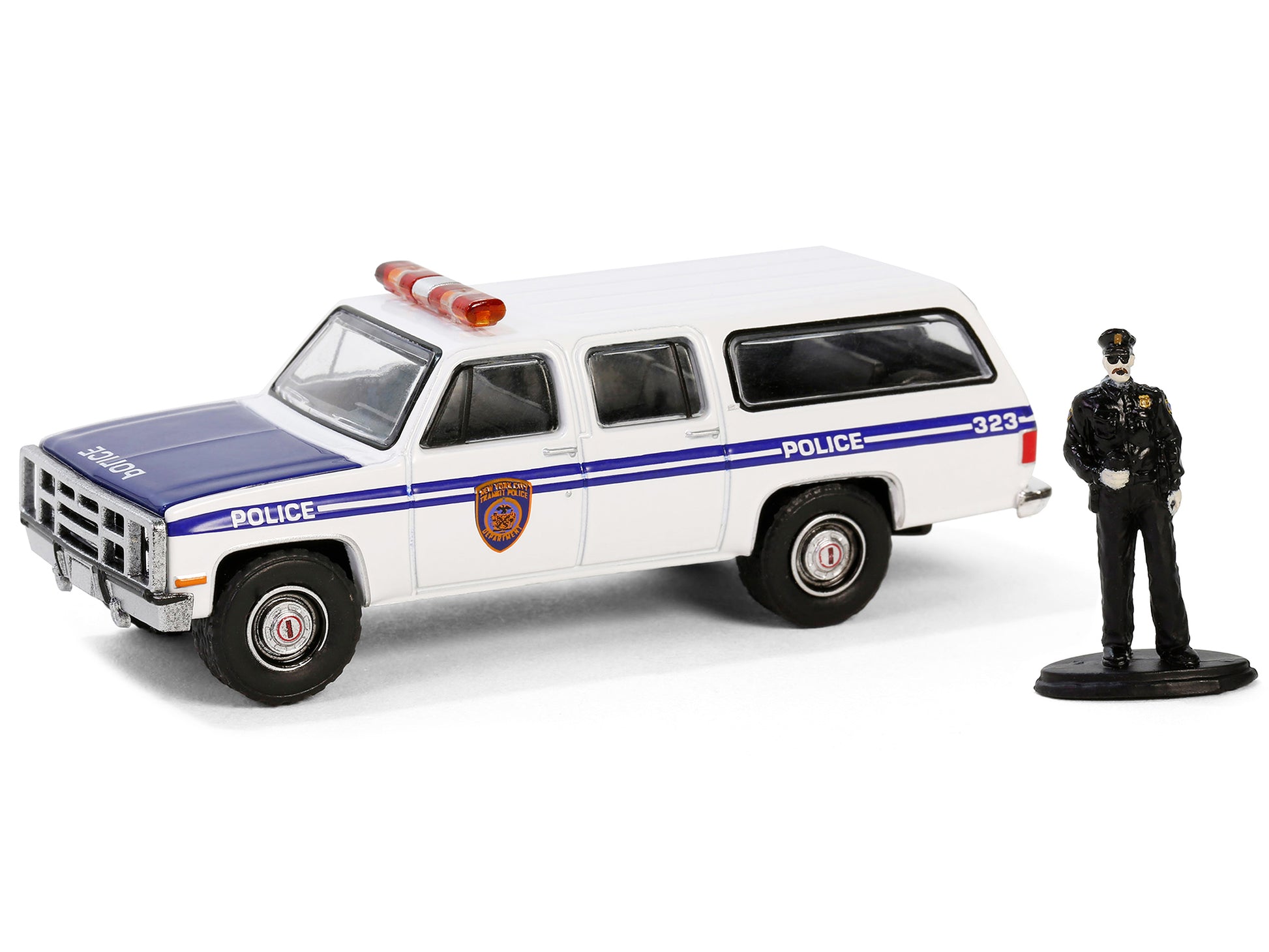 1985 GMC Suburban 2500 "New York City Transit Police Department" White with Blue Stripes and Police Officer Figure "The Hobby Shop" Series 16 1/64 Diecast Model Car by Greenlight