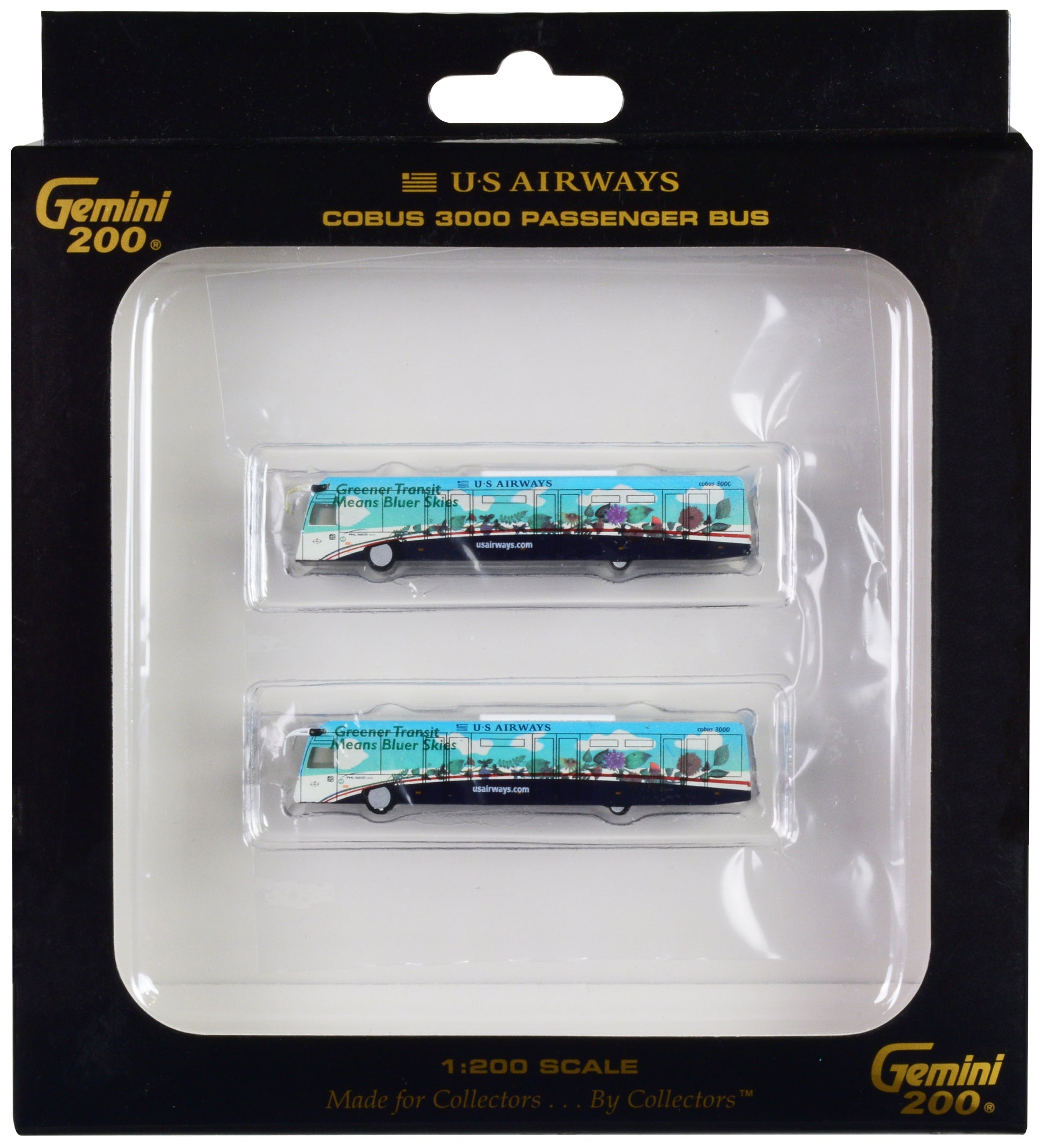Cobus 3000 Passenger Bus White and Blue with Graphics "US Airways Shuttle Bus - Greener Transit" 2 Piece Set "Gemini 200" Series Diecast Models by GeminiJets