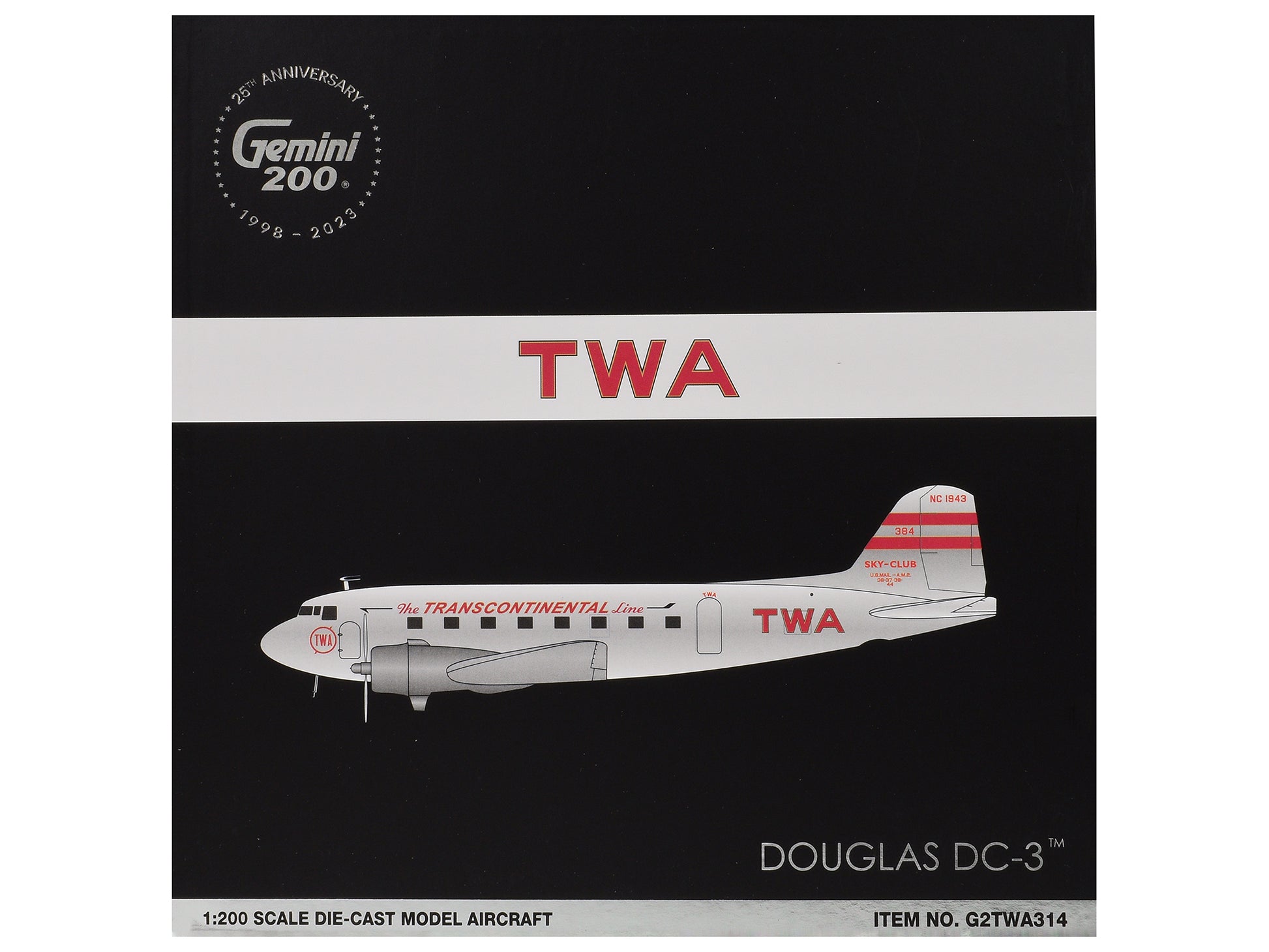 Douglas DC-3 Commercial Aircraft "TWA (Trans World Airlines)" (NC1943) Polished Metal Finish with Red Tail Stripes "Gemini 200" Series 1/200 Diecast Model Airplane by GeminiJets