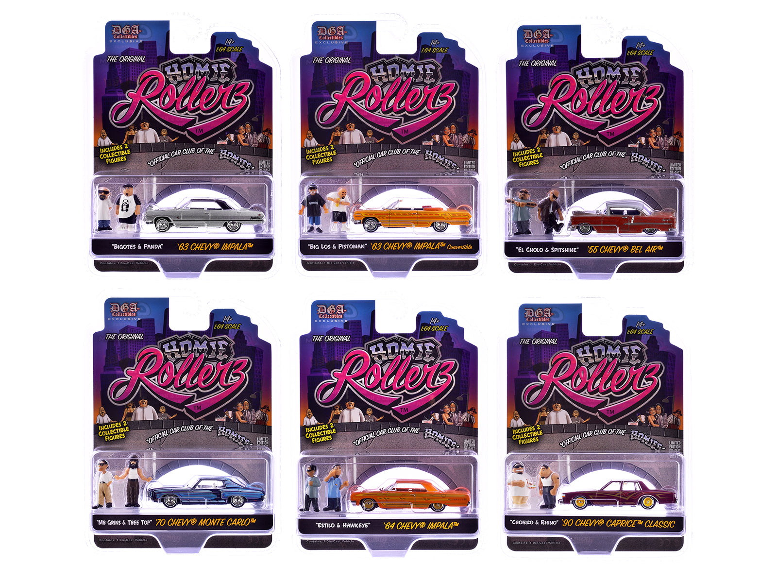 "Homie Rollerz" 2025 Series 1 Set of 6 Pieces Diecast Model Cars by Greenlight and DGA Made by Greenlight and DGA. Category: Chevrolet Models, 1/64 Scale Sets. High-quality diecast collectible.